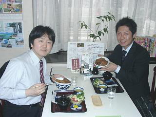 | 福井テレビ 月曜19:28〜放送 『い〜ざぁ ええDay』(4/26放送予定)の撮影で 『はなわ』さんが来て下さいました。 当店のソースカツ丼を大変気に入ってくれました。 これからのご活躍、応援しています! |